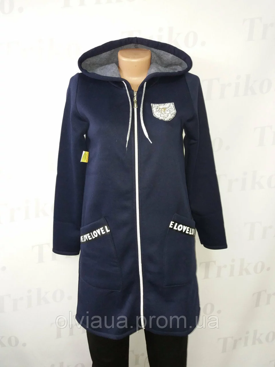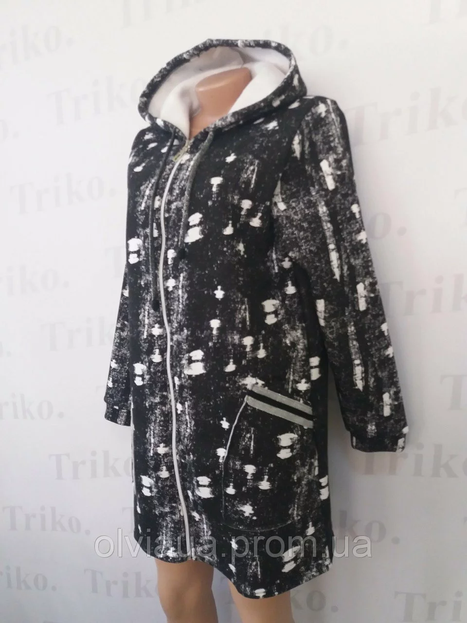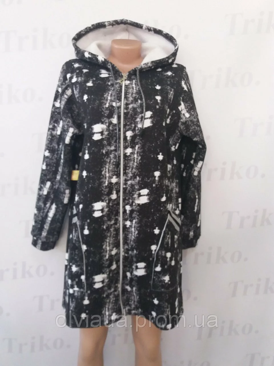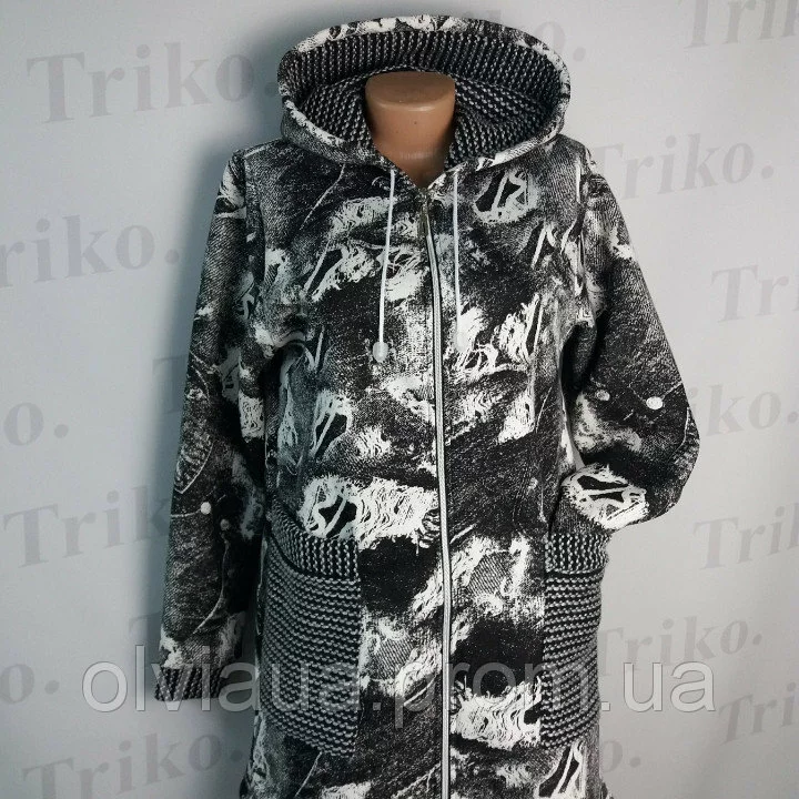 Кардиган на флисе : с капюшоном,накладными карманами , на молнии . Размер: 44,46,48,50,52,54. Полотно : трёхнитка на флисе .