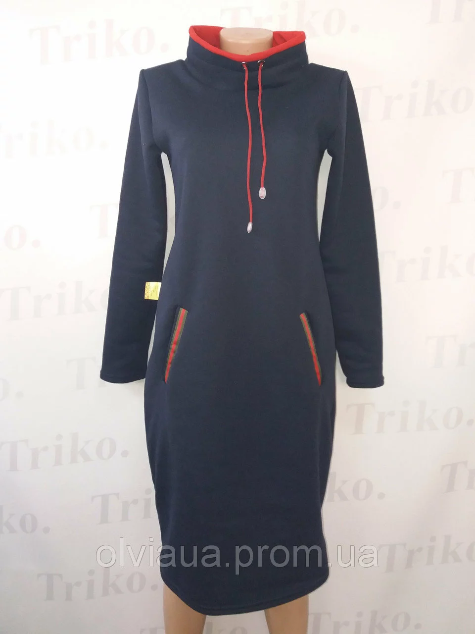 Платье на флисе , горловина - хомут с подкладкой , потайные карманы размеры 42,44,46,48 ткань трех нить,цвет темносиний,черны